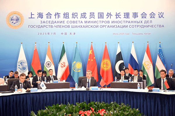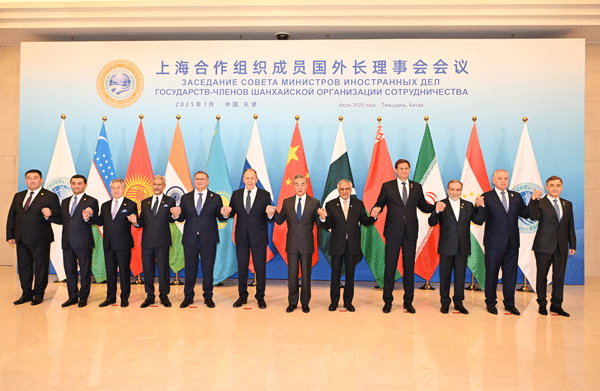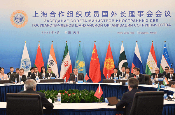 2025年7月15日,中共中央政治局委员、外交部长王毅在天津主持上海合作组织成员国外长理事会会议。白俄罗斯外长雷任科夫、印度外长苏杰生、伊朗外长阿拉格齐、哈萨克斯坦副总理兼外长努尔特列乌、吉尔吉斯斯坦外长库鲁巴耶夫、巴基斯坦副总理兼外长达尔、俄罗斯外长拉夫罗夫、塔吉克斯坦外长穆赫里丁、乌兹别克斯坦外长赛义多夫、上合组织秘书长叶尔梅克巴耶夫、上合组织地区反恐怖机构执委会主任沙尔舍耶夫出席。